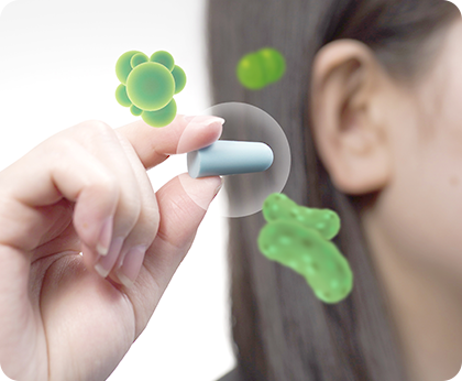抗菌耳せん mimotは、特殊な工法で作られた清潔な「抗菌耳せん」です。一般的にPUフォームタイプの耳せんは、手で耳せんを揉んで細くし耳穴に挿入するため、手に付着しているたくさんの“細菌”を耳せんに再付着させることになります。抗菌耳せん mimotは抗菌処理を施したことにより、細菌の増殖を抑える効果があります。